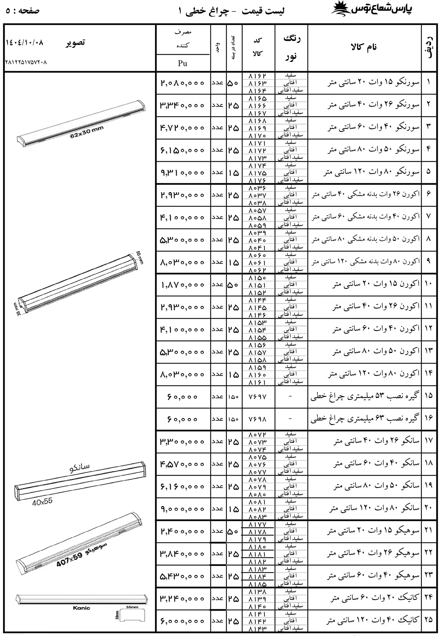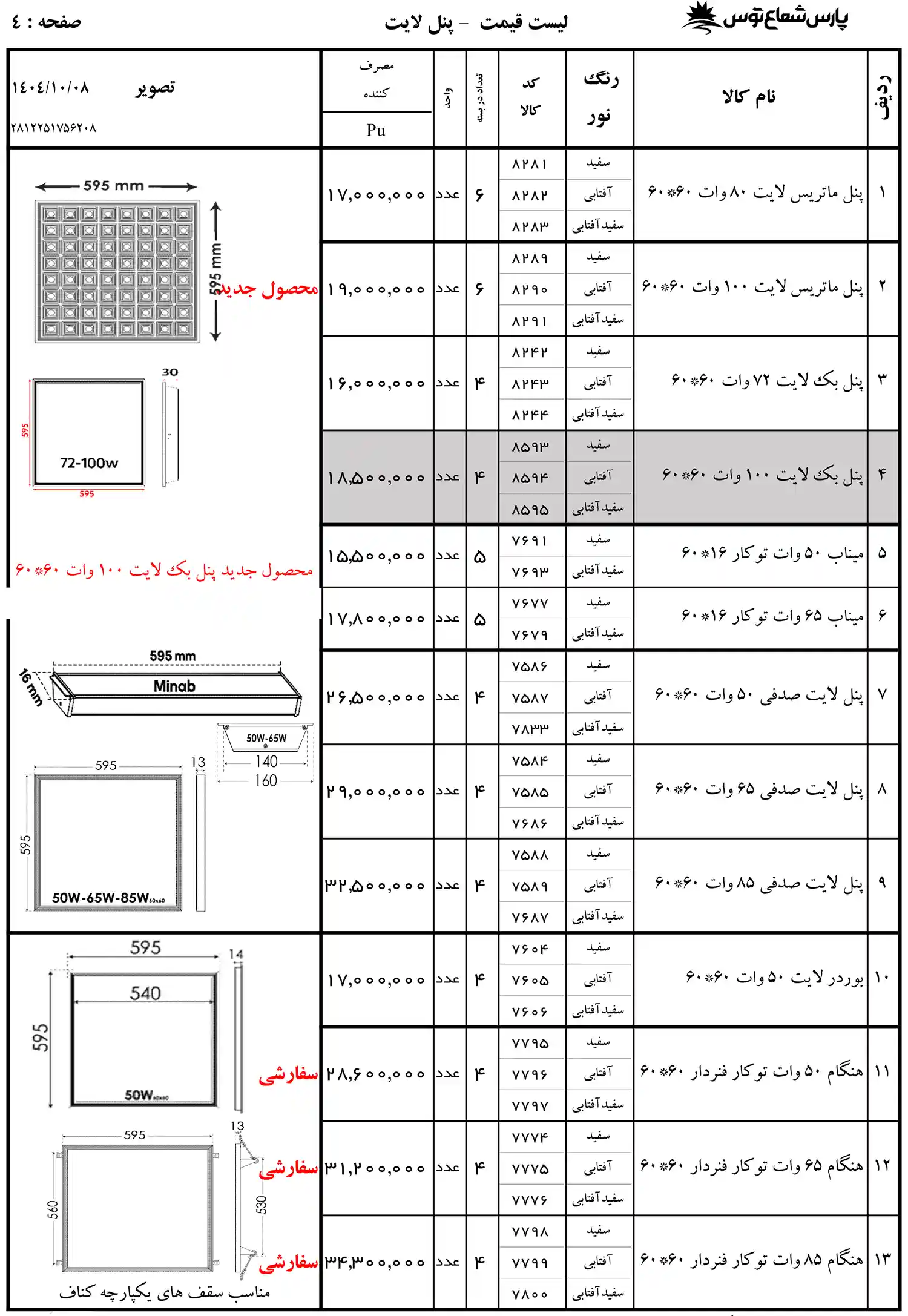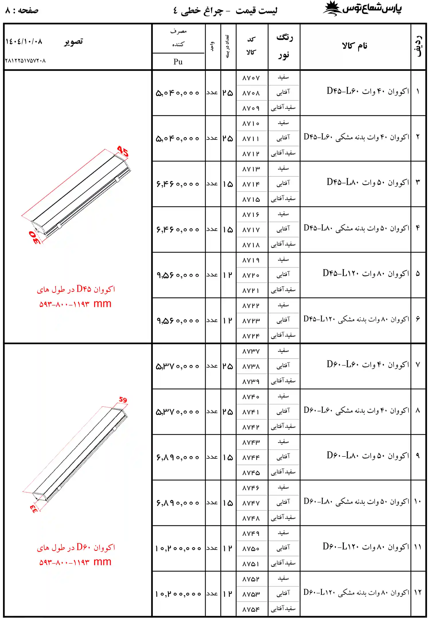 لیست قیمت پارس شعاع توس 1404