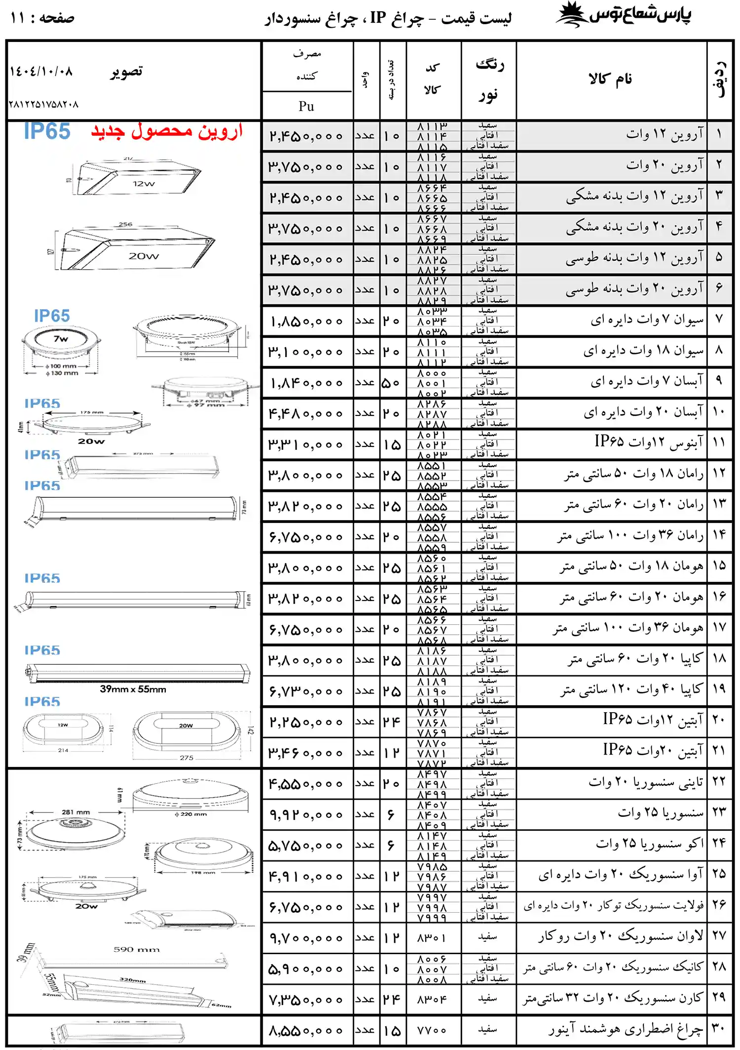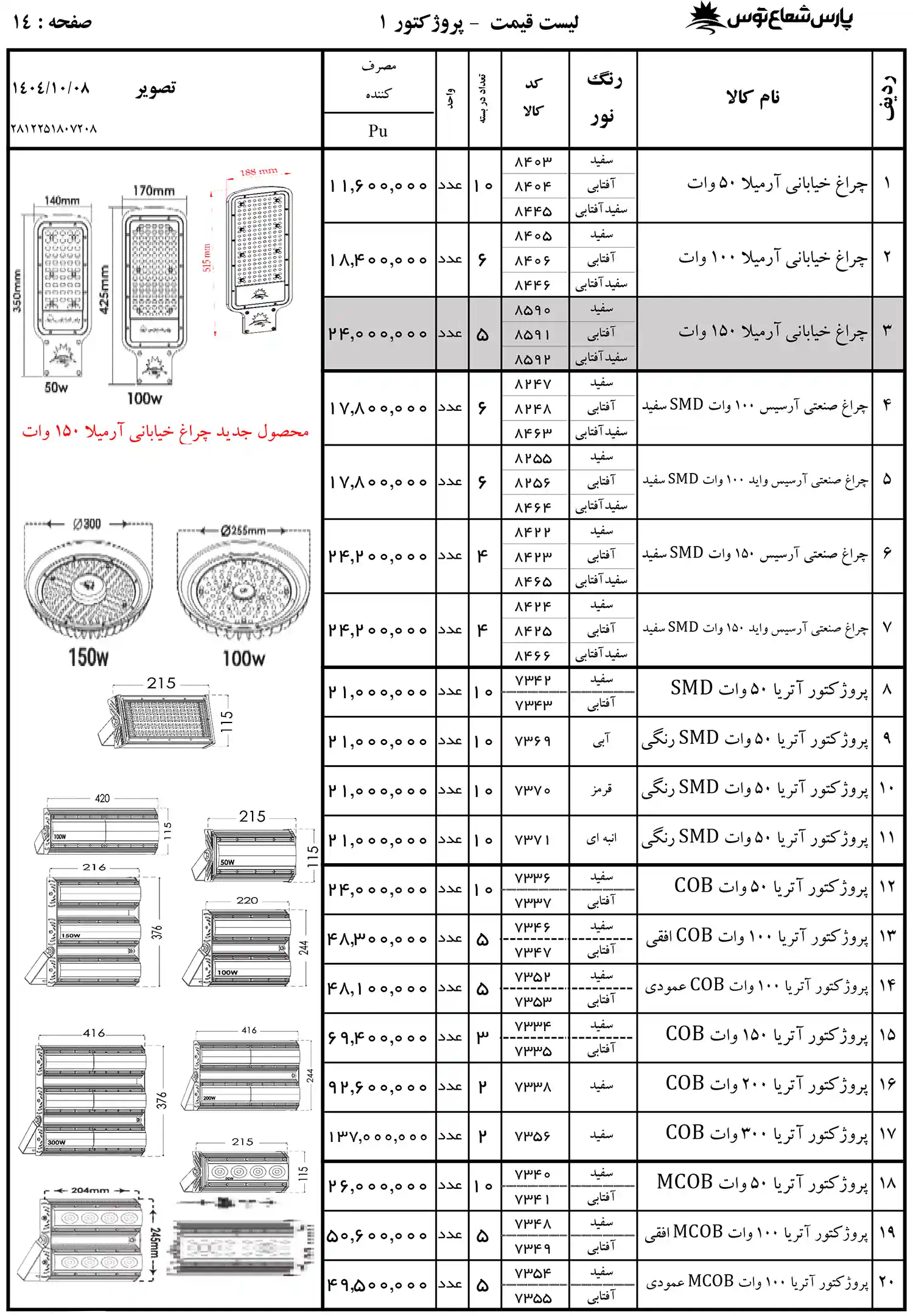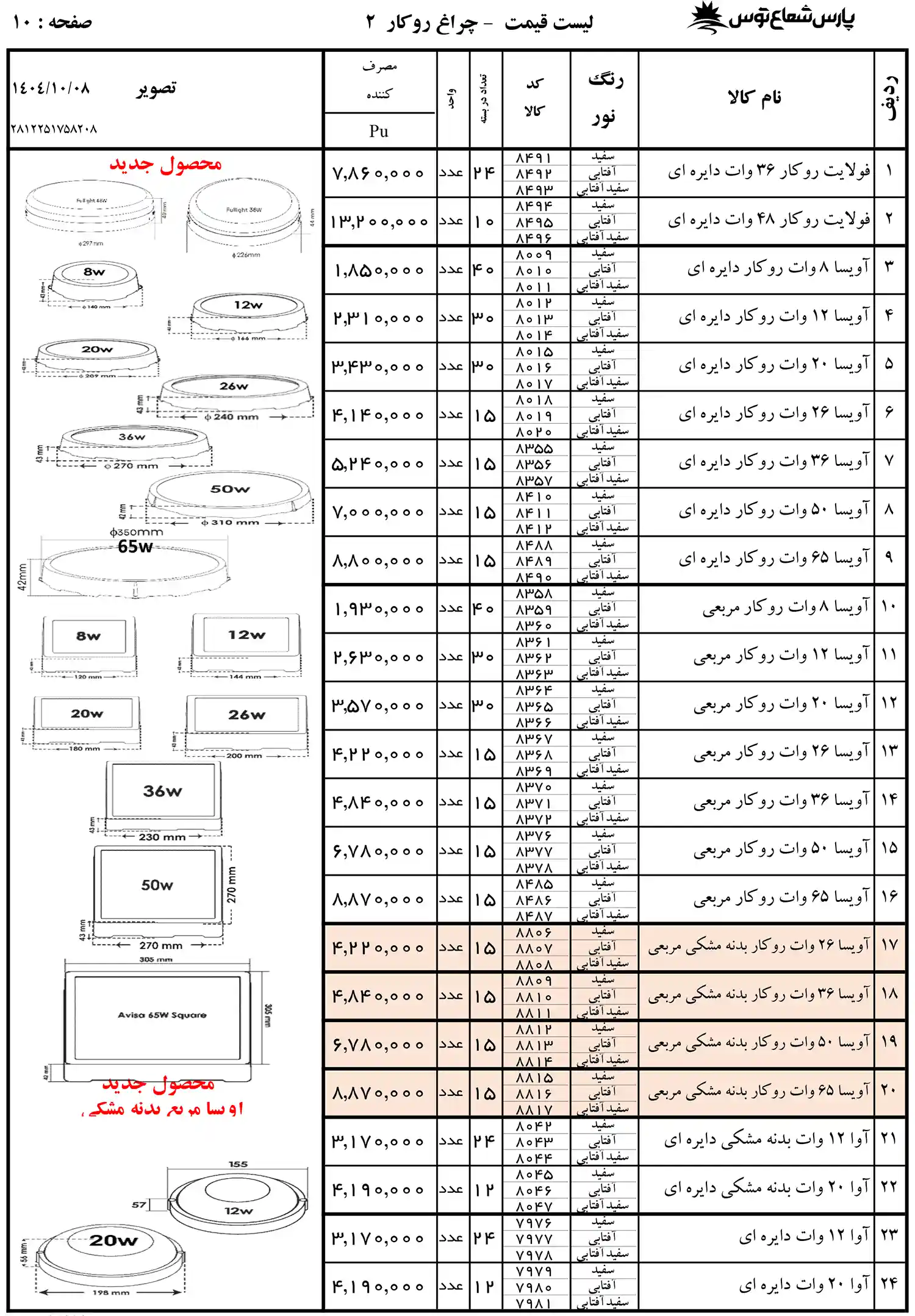 لیست قیمت پارس شعاع توس به صورت کامل با ذکر مشخصات هر محصول در لیست زیر قرار گرفته است. پارس شعاع از برند های پیشرو در روشنایی است که محصولات متنوعی از جمله لامپ ال ای دی، پنل سقفی، چراغ ریلی، پروژکتور،چراغ سقفی، وال واشر، کلید خودکار، کلید محافظ جان، باتری، منبع تغذیه، دیفیوزر و بسیاری محصول دیگر را تولید و عرضه می کند. اگر به دنبال بررسی و مقایسه قیمت محصولات هستید مشاهده لیست قیمت محصولات پارس شعاع توس می تواند کمک بزرگی در انتخاب محصول مورد نظر شما داشته باشد. زیرا با شناخت ویژگی ها و کاربرد های هر محصول می توانید تصمیم گیری بهتری در خرید داشته باشید. در جدول زیر اطلاعات محصول از قبیل توان، نوع نوردهی، مدل نصب و مدل های سنسور دار و ضد آب درج شده است. برای اطلاع از لیست قیمت پارس شعاع توس در نمایندگی لاله زار باید به سایت معتبر مراجعه کنید. فروشگاه شایان به عنوان نمایندگی رسمی تمامی محصولات این برند را با گارانتی به مصرف کنندگان عرضه می کند. از مزایای این برند بهره گیری از تکنولوژی روز دنیا برای تولید محصولات در کنار قیمت مناسب است. با مشاهده جدول زیر می توانید متناسب با نیاز خود بهترین گزینه را از لیست قیمت پروژکتور پارس شعاع توس و یا محصولات دیگر انتخاب کرده و سفارش دهید.