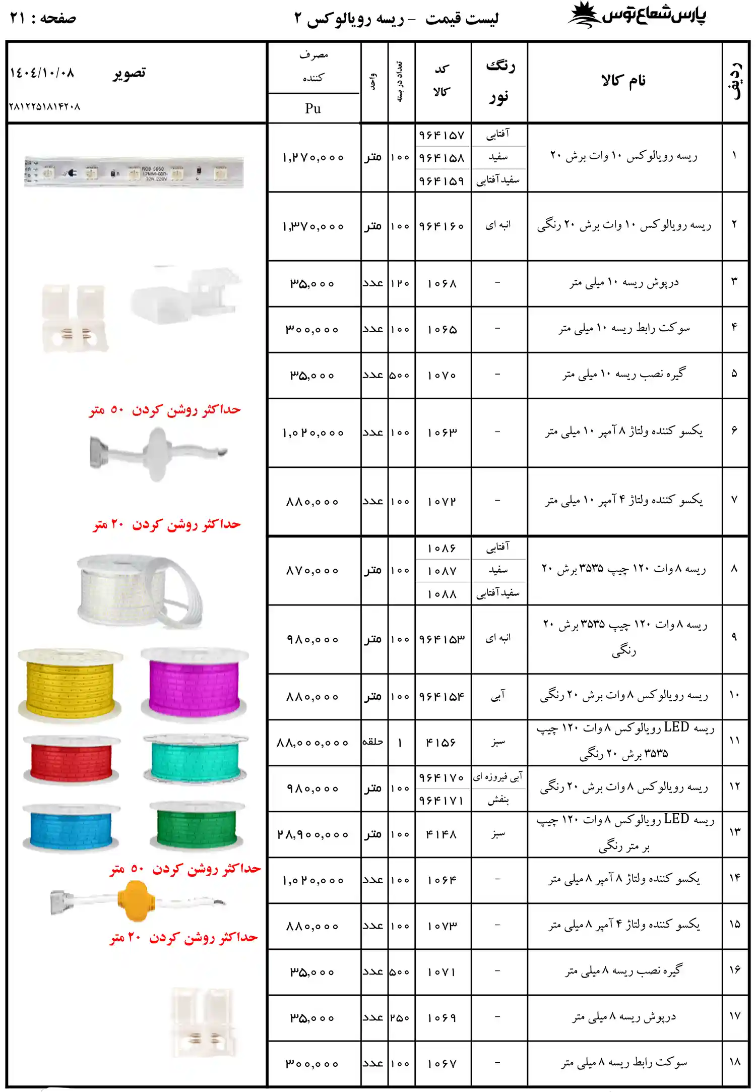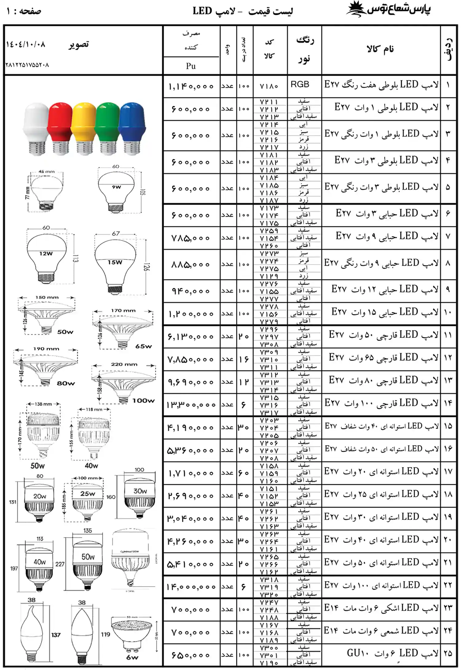 لیست قیمت لامپ پارس شعاع توس