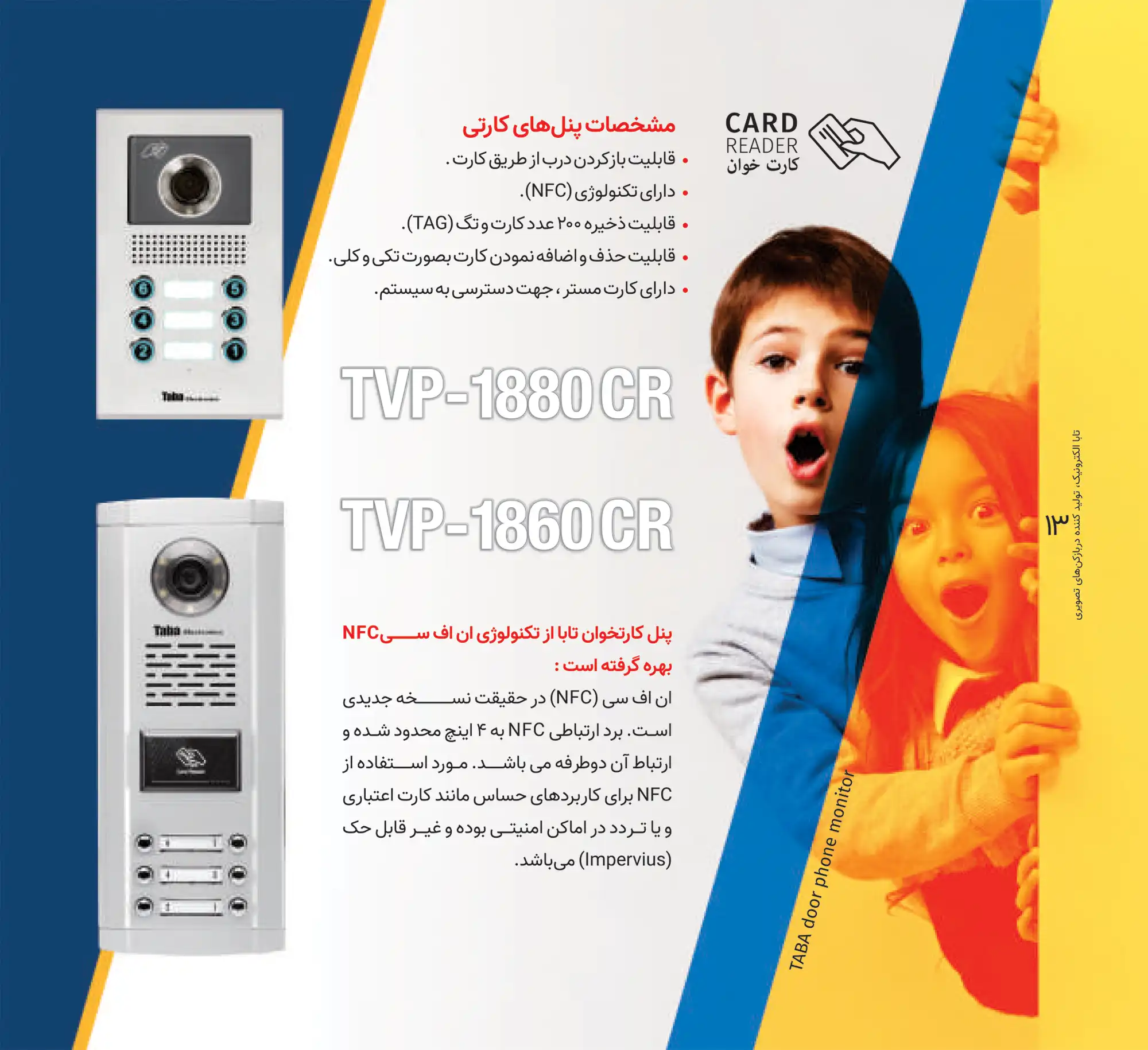 کاتالوگ آیفون تصویری تابا الکترونیک مجموعه ای کامل از محصولات باکیفیت و حرفه ای برای منزل و ساختمان ها است. در این کاتالوگ تمامی مدل ها همراه با مشخصات فنی و قابلیت ها درج شده است که در انتخاب مناسب محصول بسیار کمک کننده است. تابا الکترونیک با سال ها تجربه توانسته آیفون تصویری با بهترین کیفیت در صفحه نمایش های مختلف با امکانات متفاوتی عرضه کند. دسترسی به جزئیات فنی و ویژگیهای هر مدل مثل نوع نمایشگر، حافظه داخلی یا قابلیت کارت حافظه، نوع تصویر و صدا، اتصال به دوربین مدار بسته، باز کردن درب از راه دور و ارتباط داخلی بین واحد ها باعث می شود متناسب با محیط بهترین تصمیم گیری را داشته باشید.