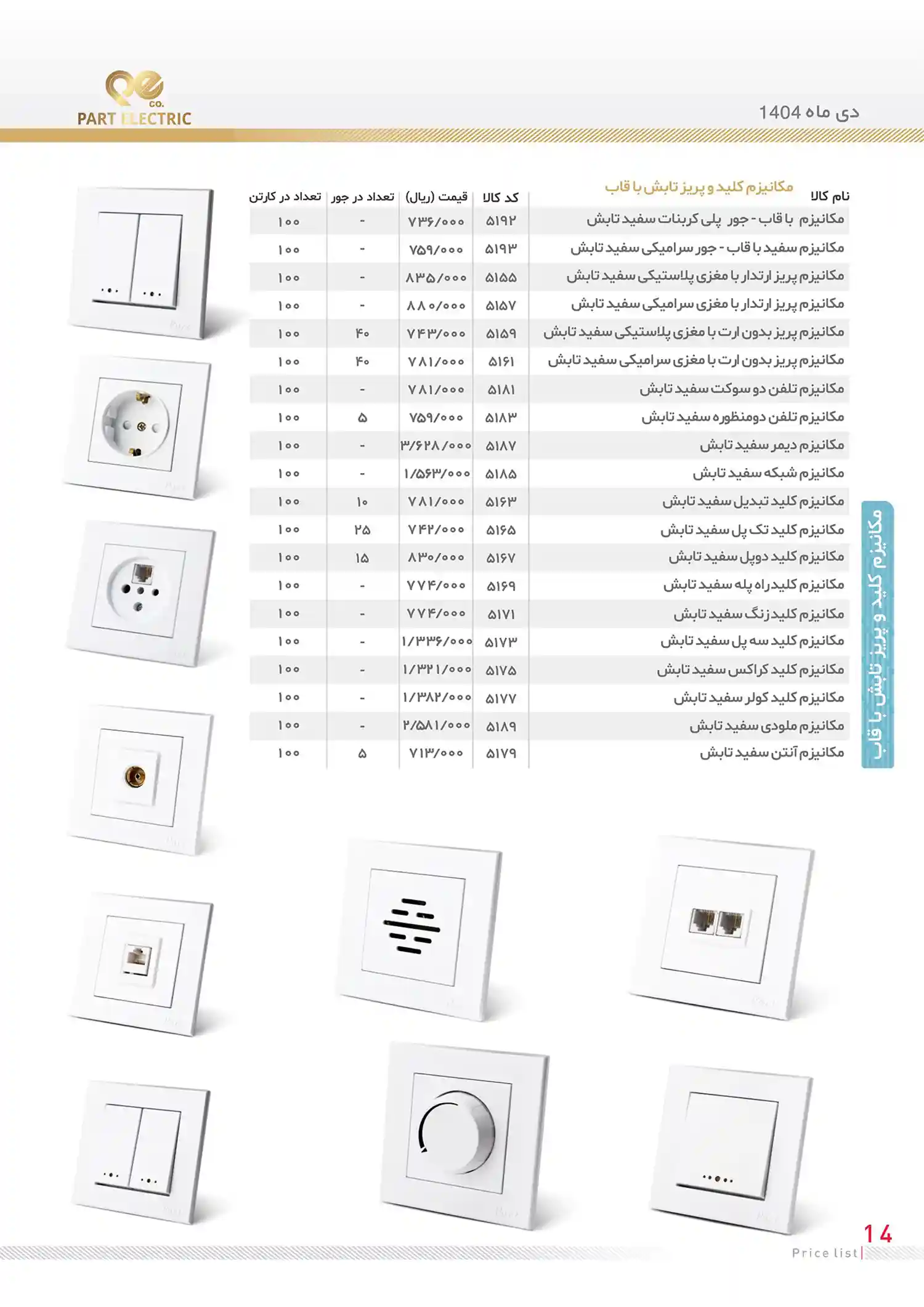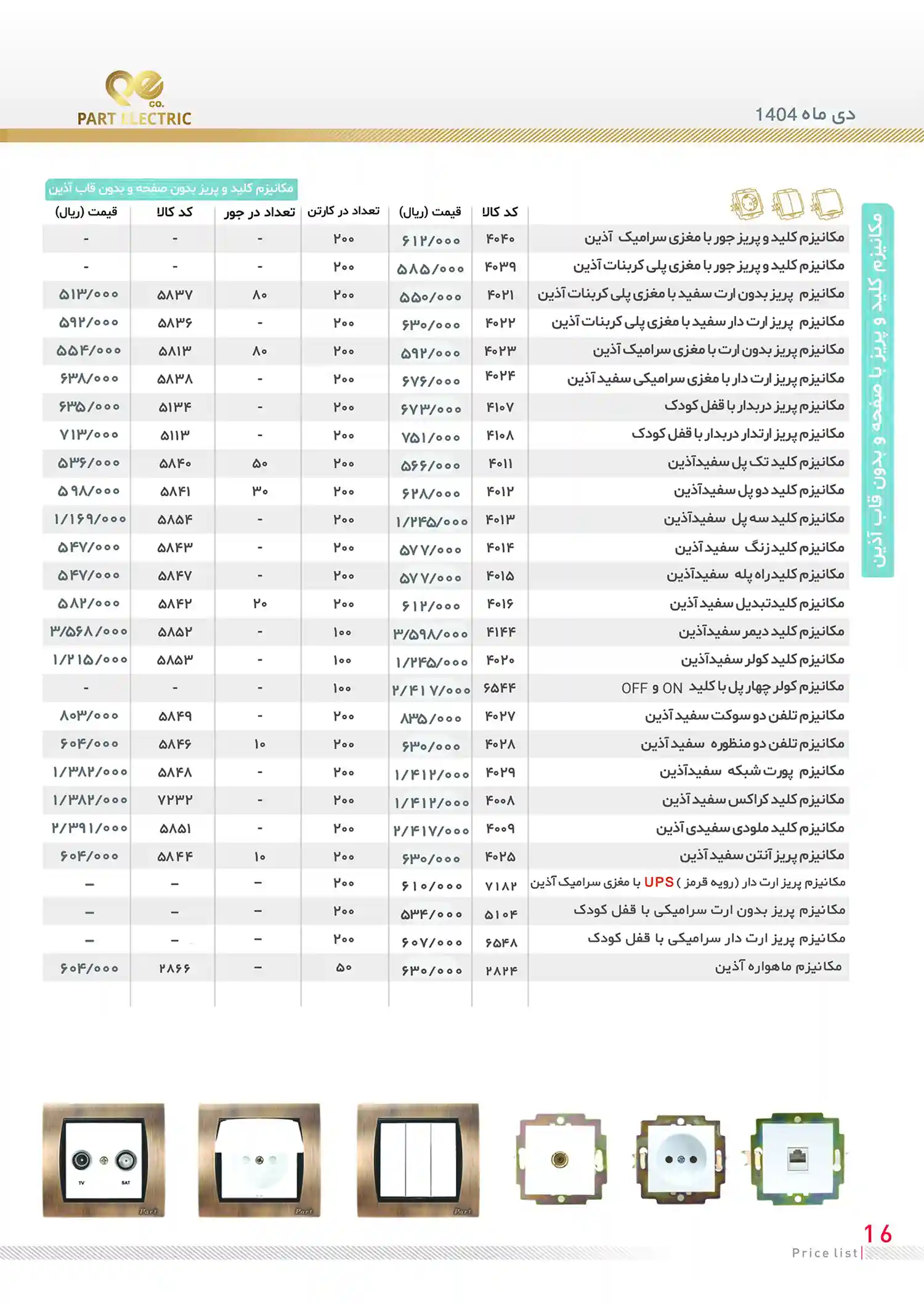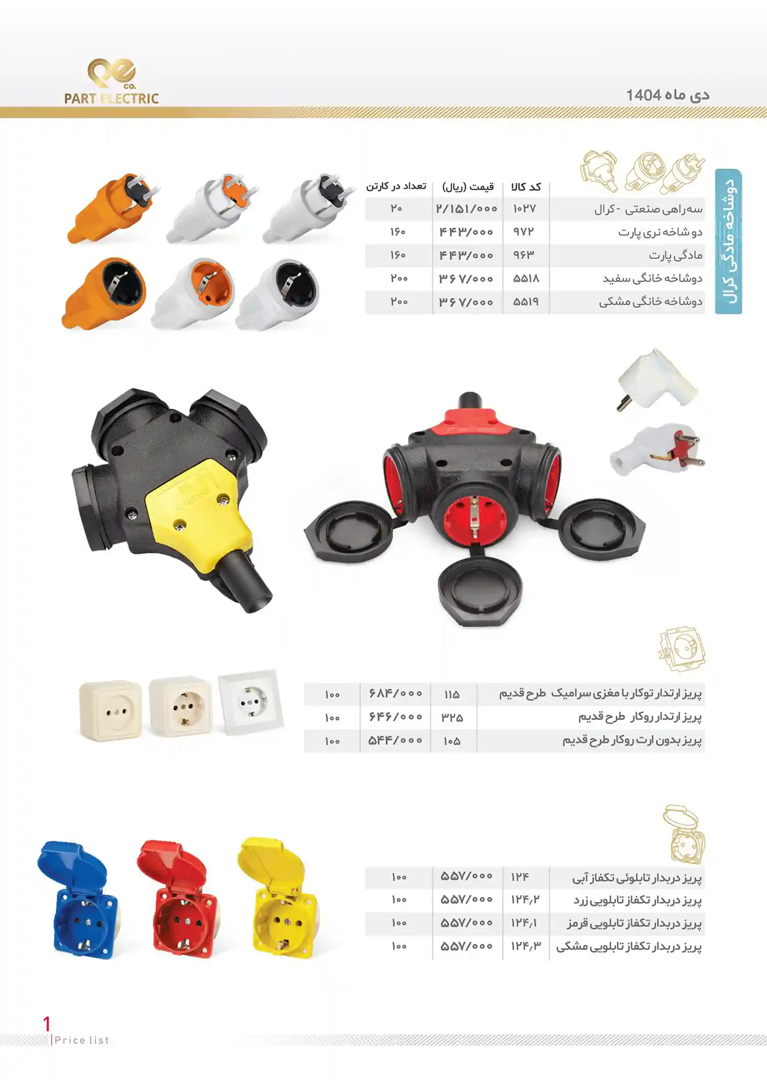 لیست قیمت کلید پریز پارت الکتریک با جدیدترین قیمت ها در سایت فروشگاه شایان در دسترس می باشد. کلید و پریزهای پارت الکتریک، با کیفیت و طراحی مدرن، از محصولات پرفروش در بازار ایران هستند. فروشگاه شایان به عنوان یکی از نمایندگیهای معتبر این برند، انواع محصولات پارت الکتریک را با بهترین قیمت عرضه میکند. لیست قیمت کلید و پریز پارت الکتریک در انواع مدل ها به صورت تفکیک شده برای شما قرار داده شده است. از انواع آنها می توان کلید و پریز ساده در مدل های کلاسیک و رنگی را نام برد. این مدل ها در لیست پارت دارای قیمت های اقتصادی و مناسب برای منازل و فضا های معمولی است که مطابق با دکوراسیون انتخاب می شوند. از مدل های دیگر این محصولات کلید و پریز ضد آب است که برای محیطهای مرطوب مانند حمام، آشپزخانه یا فضاهای بیرونی مناسب می باشد. همچنین در لیست قیمت جدید پارت الکتریک، پریز های ارت دار و بدون ارت نیز معرفی شده اند که برای ایمنی بیشتر در برابر نشتی برق مورد استفاده قرار می گیرند.