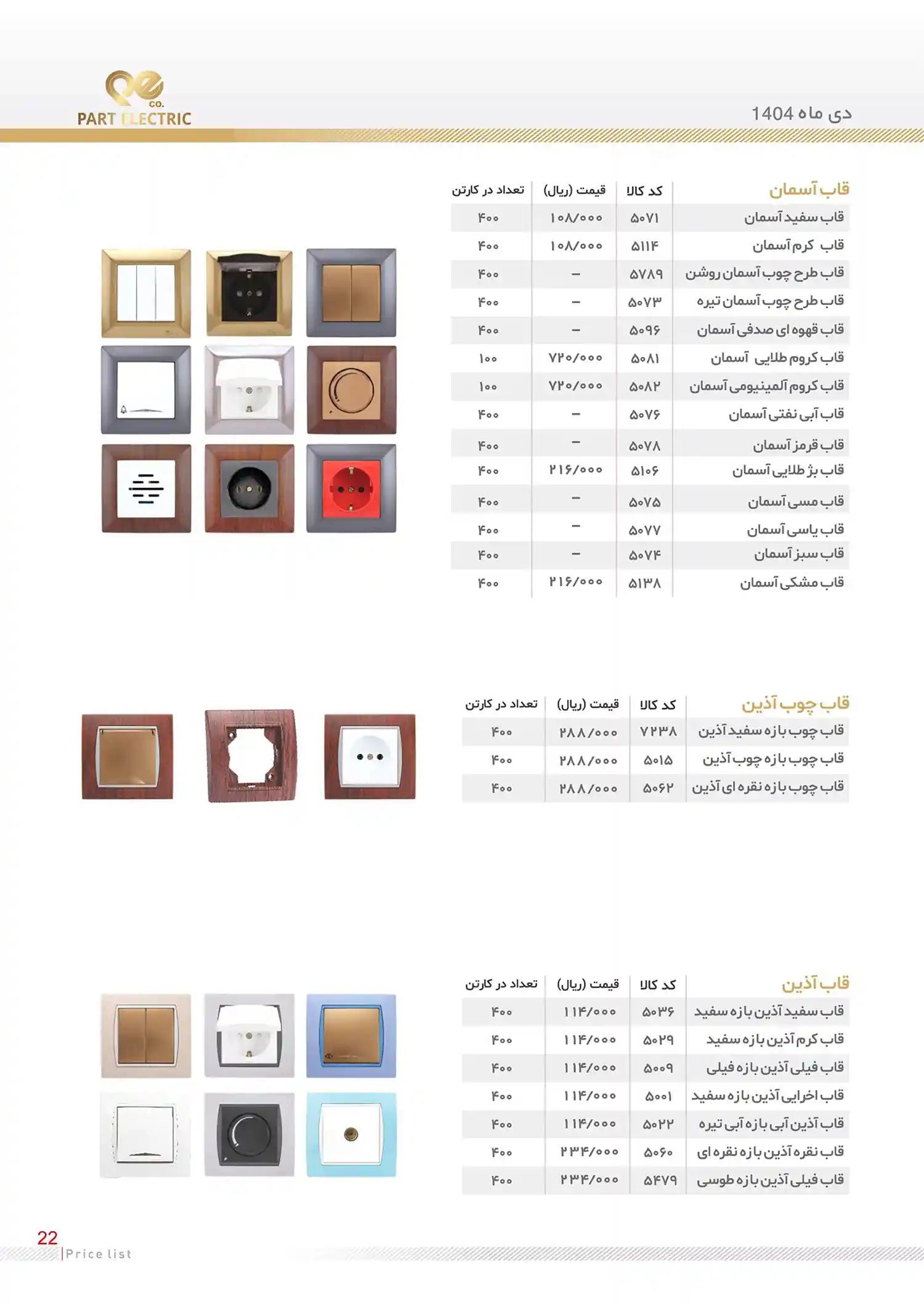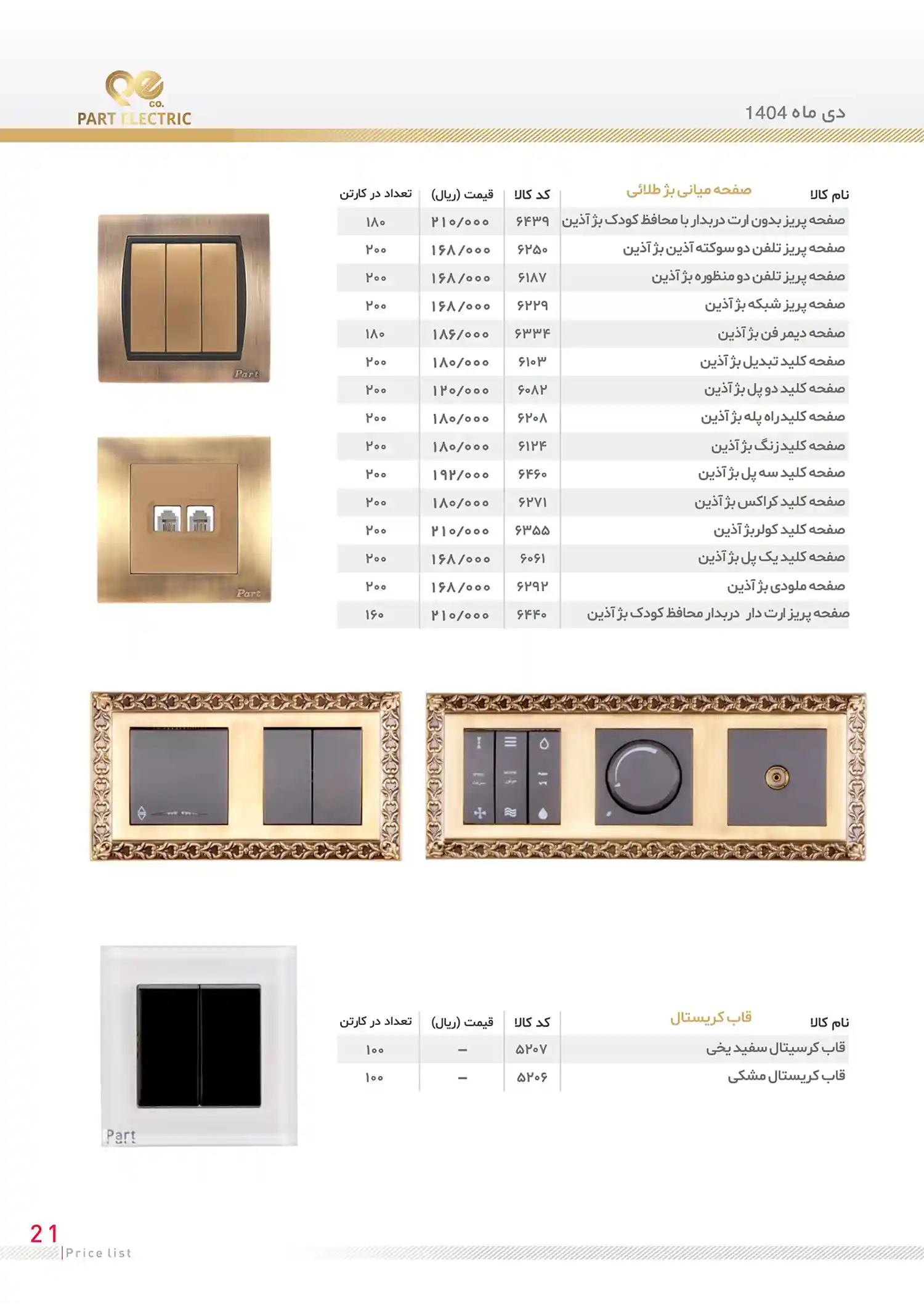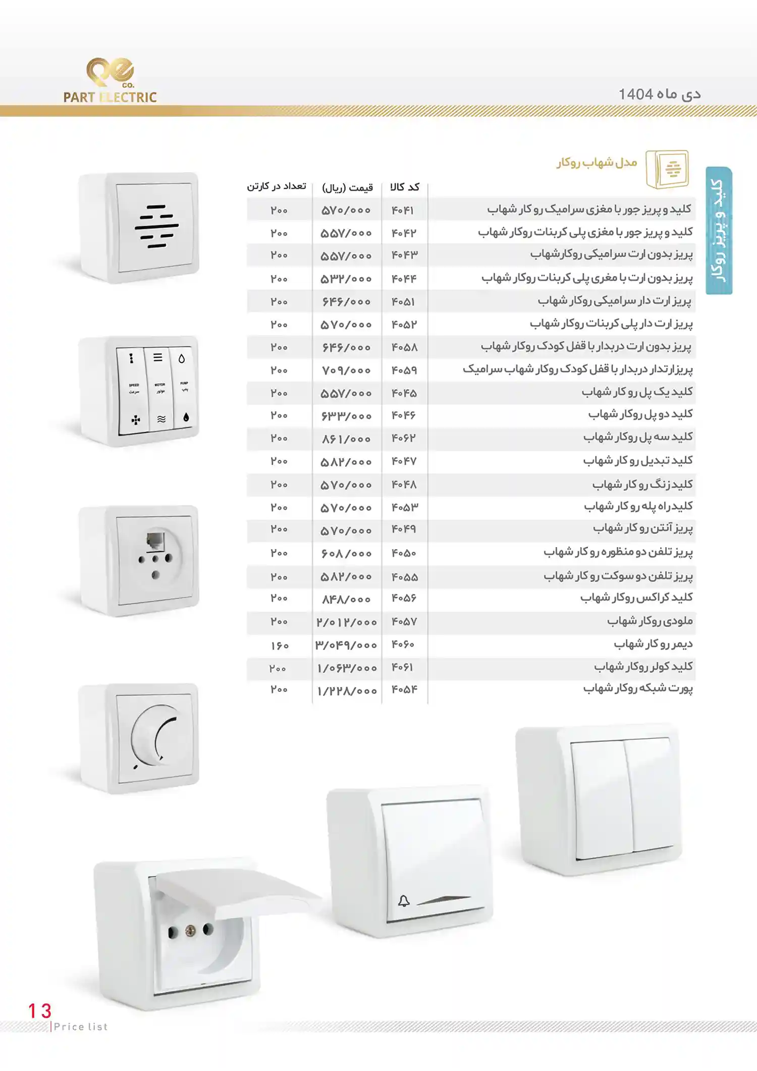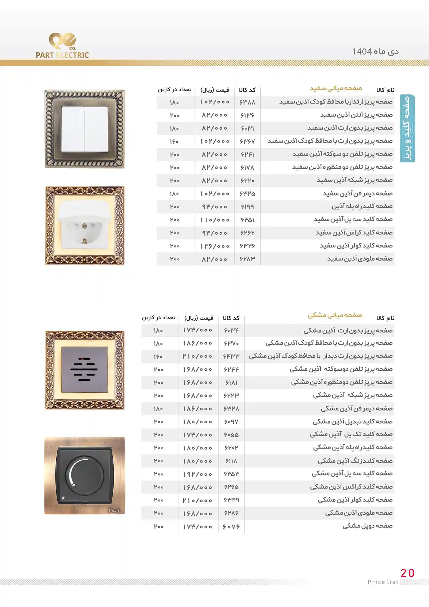 لیست قیمت کلید پریز پارت الکتریک با جدیدترین قیمت ها در سایت فروشگاه شایان در دسترس می باشد. کلید و پریزهای پارت الکتریک، با کیفیت و طراحی مدرن، از محصولات پرفروش در بازار ایران هستند. فروشگاه شایان به عنوان یکی از نمایندگیهای معتبر این برند، انواع محصولات پارت الکتریک را با بهترین قیمت عرضه میکند. لیست قیمت کلید و پریز پارت الکتریک در انواع مدل ها به صورت تفکیک شده برای شما قرار داده شده است. از انواع آنها می توان کلید و پریز ساده در مدل های کلاسیک و رنگی را نام برد. این مدل ها در لیست پارت دارای قیمت های اقتصادی و مناسب برای منازل و فضا های معمولی است که مطابق با دکوراسیون انتخاب می شوند. از مدل های دیگر این محصولات کلید و پریز ضد آب است که برای محیطهای مرطوب مانند حمام، آشپزخانه یا فضاهای بیرونی مناسب می باشد. همچنین در لیست قیمت جدید پارت الکتریک، پریز های ارت دار و بدون ارت نیز معرفی شده اند که برای ایمنی بیشتر در برابر نشتی برق مورد استفاده قرار می گیرند.