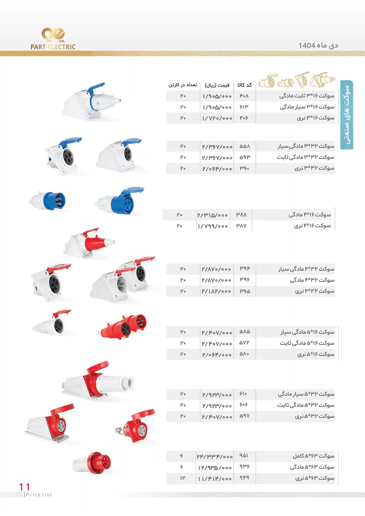 سوکت پارت الکتریک و لیست قیمت آن در فروشگاه شایان، نمایندگی رسمی این برند را در جدول زیر برایتان تهیه کرده ایم. با استفاده از لیست قیمت پارت الکتریک می توانید متناسب با نیاز و بودجه خو بهترین محصول را خریداری نمایید. سوکتها به عنوان یکی از تجهیزات حیاتی در سیستم های برقی، نقش مهمی در انتقال ایمن و پایدار جریان الکتریکی دارند. شرکت پارت الکتریک به عنوان یکی از برندهای برتر، سوکتهای با کیفیتی ارائه میدهد که در بسیاری از صنایع و کاربرد های خانگی و صنعتی استفاده میشوند. قیمت سوکت پارت الکتریک بسته به نوع و مشخصات فنی آن ها متفاوت است. عواملی مانند توان جریان، جنس بدنه، استانداردهای ایمنی و ویژگیهای خاص مانند ضدآب بودن تاثیر مستقیم بر قیمت دارند. به طور کلی، خرید از نمایندگیهای رسمی این شرکت و مشاهده لیست پارت الکتریک، بهترین گزینه برای اطمینان از قیمت مناسب و اصالت کالا است. فروشگاه شایان خدمات پس از فروش و گارانتی محصولات را نیز ارائه میدهند که یک مزیت بزرگ محسوب میشود. در لیست قیمت محصولات پارت الکتریک تمام محصولات با قیمت های اصلی و بدون واسطه درج شده است.