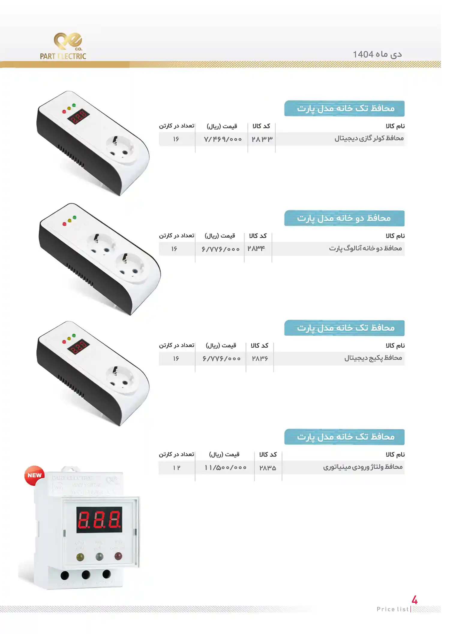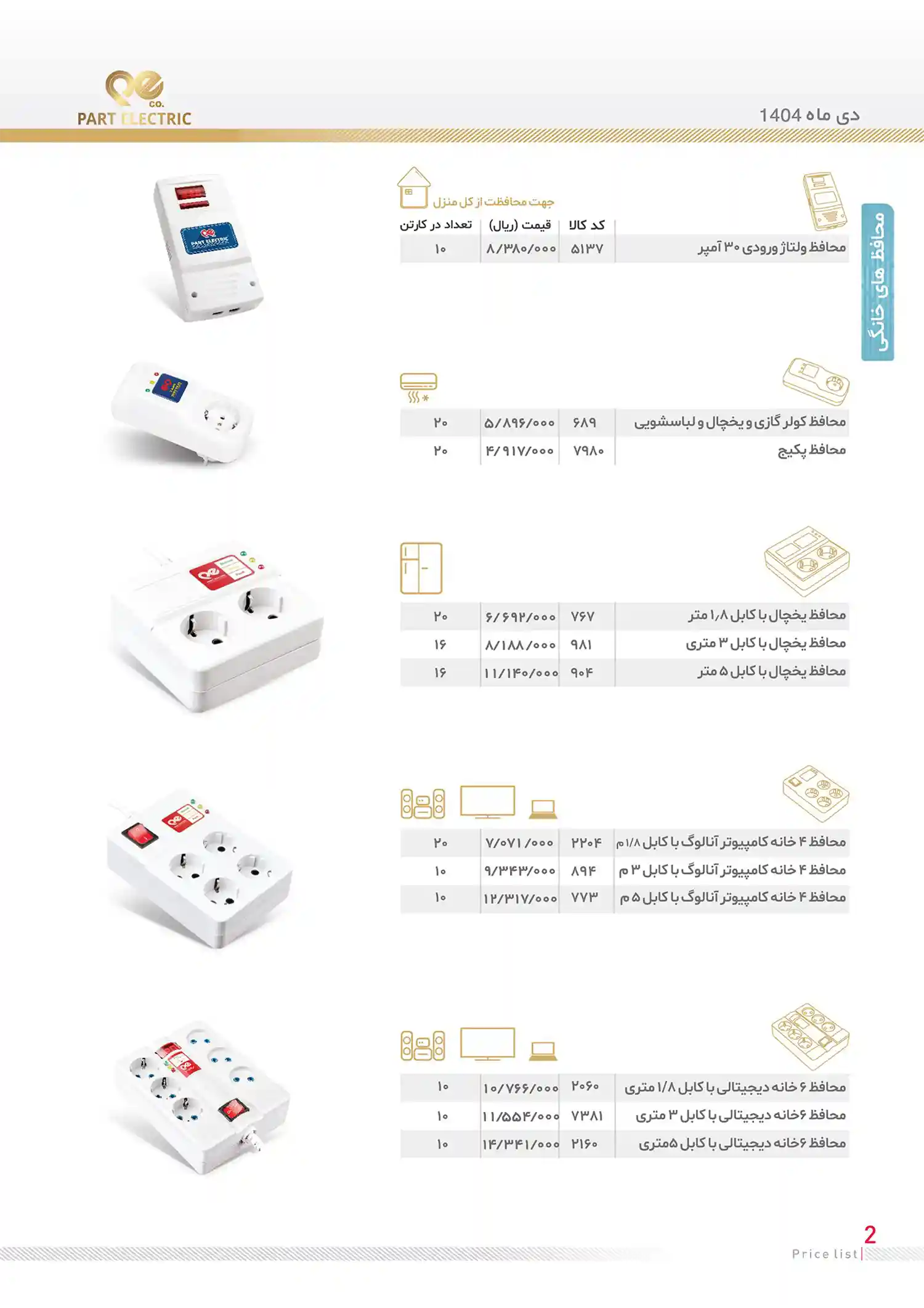 Toggleلیست قیمت محافظ برق پارت الکتریک به شما این کمک را می کند تا تمام محافظ ولتاژ های ساخت این شرکت را به صورت یکجا مشاهده نمایید. محافظ برق پارت الکتریک با مغزی از جنس پلی آمید در دو نوع آنالوگ و دیجیتال، با متراژ کابل های متفاوت اعم از 1.5 متری، 3 متری و 5 متری تولید شده است. هنگام خرید محافظ برق علاوه بر متراژ کابل به تعداد خانه ی آن نیز توجه کنید که این شرکت لیست قیمت محافظ پارت الکتریک خود را با عنوان یک خانه، سه خانه، چهارخانه و شش خانه به بازار معرفی کرده است. شما در لیست قیمت محصولات پارت الکتریک میتوانید انواع محافظ برق برای یخچال، کامپیوتر، کولر گازی، لباسشویی، پکیج و محافظ ولتاژ ورودی پارت را مشاهده و خریداری کنید. پارت الکتریک لیست قیمت محصولات را در بازه زمانی مناسب به روز رسانی می کند. محافظ پارت برای حفاظت از وسایل الکترونیکی در برابر نوسانات برقی طراحی شدهاند. از ویژگی های محافظ پارت میتوان به حفاظت از دستگاهها در برابر نوسانات ولتاژ اشاره کرد. همچنین طراحی کاربر پسند یعنی تولید محصولات در اندازه های متناسب و گارانتی محصولات از ویژگی های اساسی این برند است. در این لیست، قیمت چهار راهی برق پارت الکتریک نیز ارائه شده است.