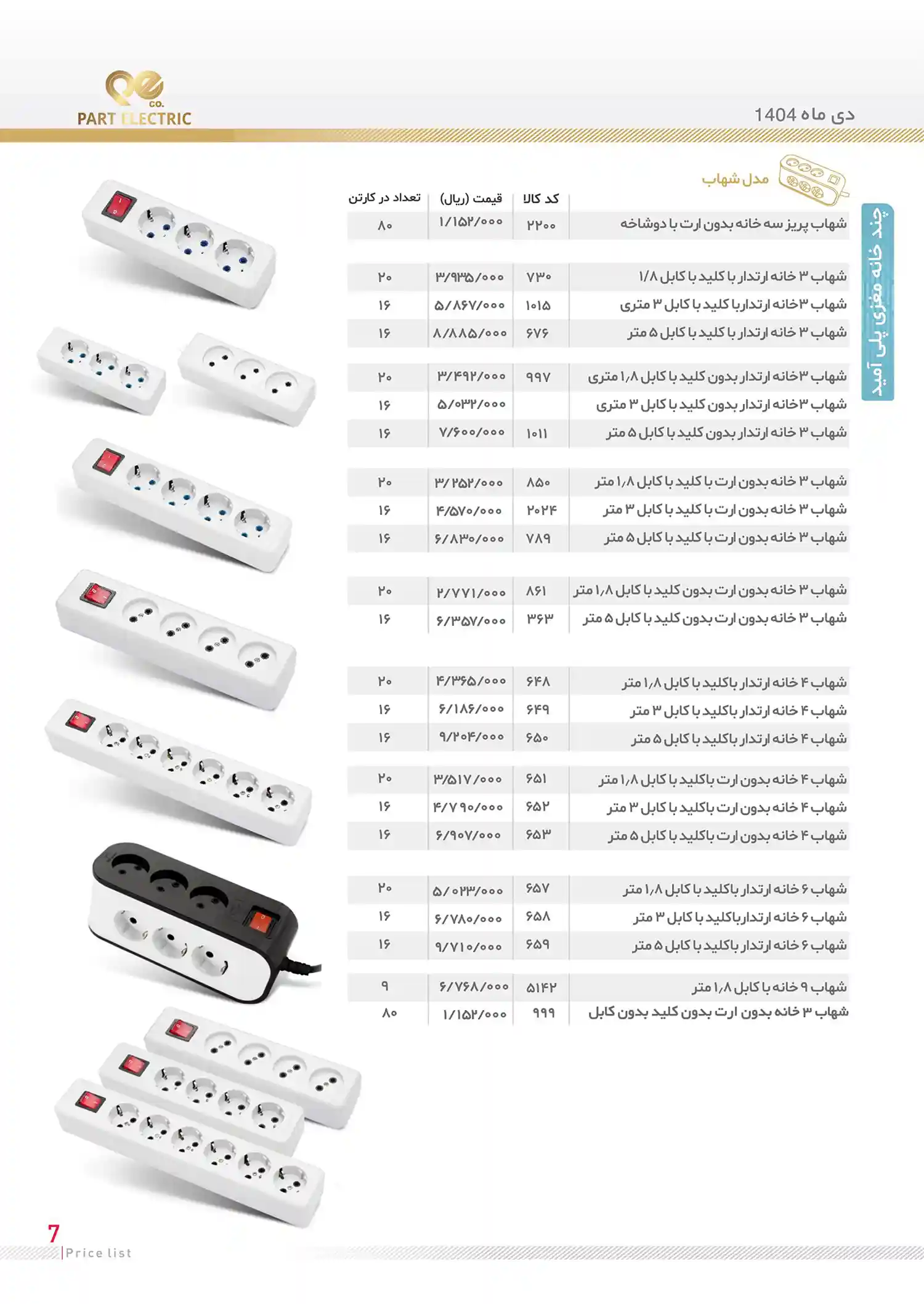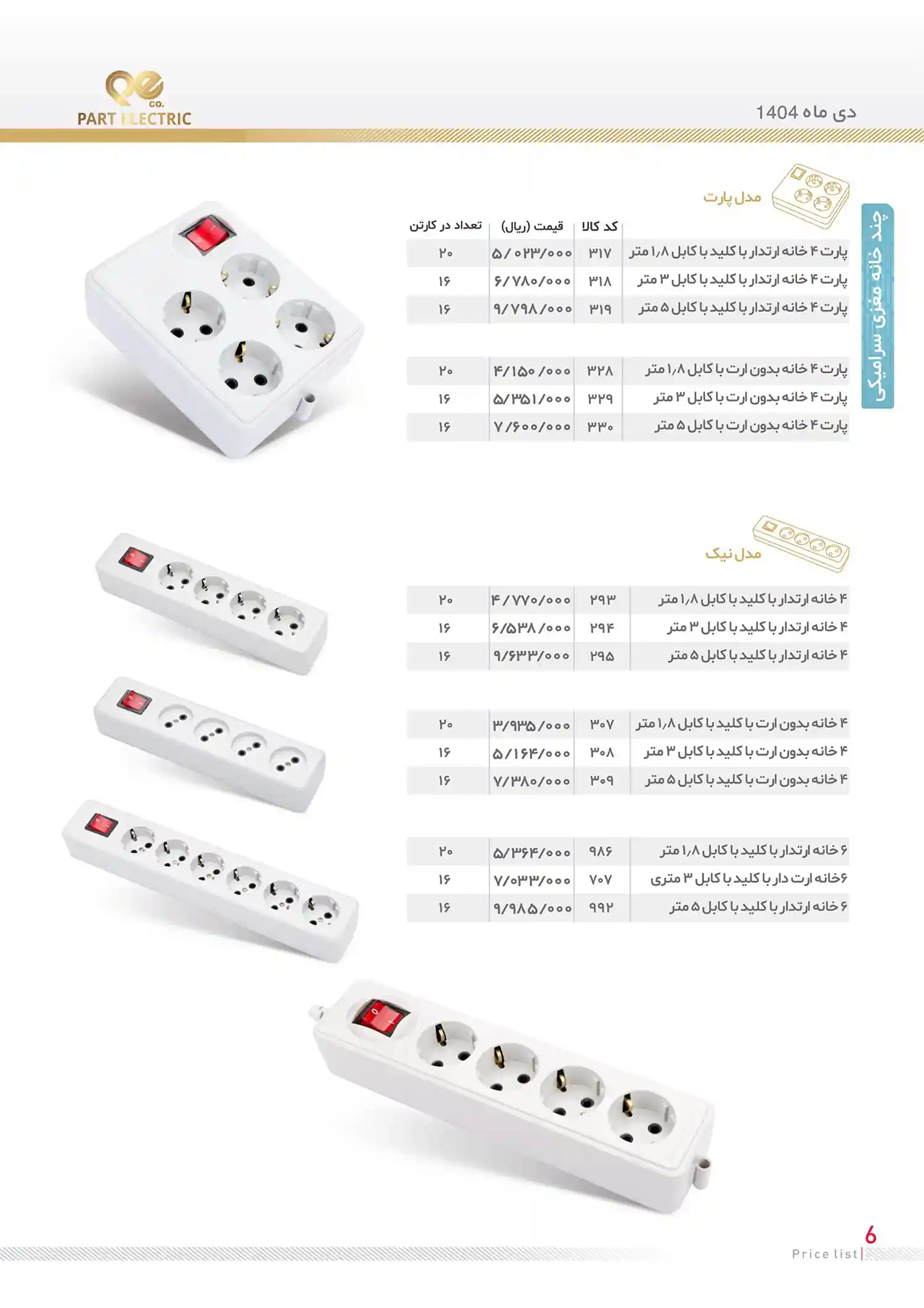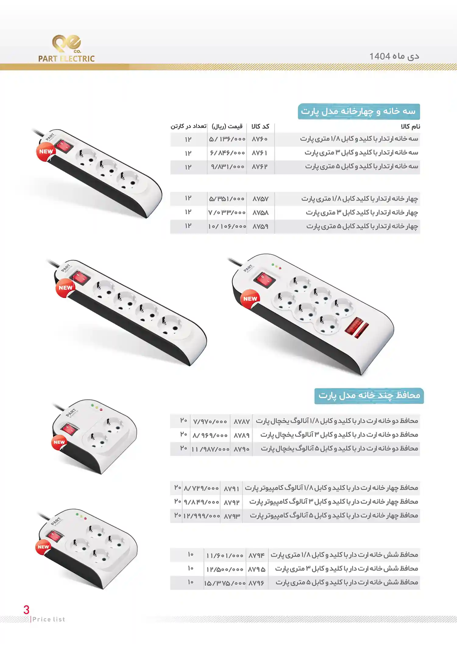 لیست قیمت پارت الکتریک 1404 در سایت درج شده است که شامل محصولات الکتریکی اعم از محافظ برق، چند راهی برق، استابلایزر، هواکش و کلید و پریز می باشد. فروشگاه الکتریکی شایان واقع در خیابان لاله زار نمایندگی محصولات پارت در تهران است و لیست قیمت پارت الکتریک را در سایت خود به طور مداوم بارگذاری می کند برای اطلاع از قیمت عمده محصولات با واحد فروش فروشگاه تماس حاصل فرمایید. شرکت پارت یکی از بهترین برندها در زمینه الکتریکی در ایران می باشد که موفق به دریافت گواهی کیفیت اروپا (CE) شده است. همچنین بهره گیری از فناوری ها و تیم متخصص تاثیر فراوانی بر کیفیت محصولات دارد . این شرکت با سالها تجربه و کیفیتی بینظیر، توانسته جایگاه ویژهای در بازار برق و الکترونیک کسب کند. شما عزیزان می توانید آخرین لیست قیمت پارت الکتریک در سایت فروشگاه شایان مشاهده نمایید. محصولات این شرکت به دلیل کیفیت ساخت بالا، تنوع زیاد و از همه مهم تر گارانتی و خدمات پس از فروش بسیار محبوب شده است.